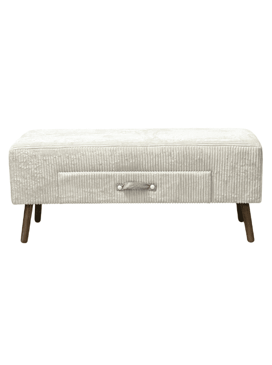 הדום מעוצב בגוון שמנת בהיר, מרופד בבד רך עם טקסטורת פסים עדינה שמוסיפה טאץ’ מודרני ונעים. המושב נוח לישיבה יומיומית, ובתוכו מגירה אינטגרלית נשלפת – פתרון חכם לאחסון פריטים קטנים ושמירה על סדר בבית. הרגליים עשויות מעץ כהה ומשלימות את המראה החמים, והעיצוב הנייטרלי משתלב בקלות בכל חלל – בסלון, בחדר השינה או בכניסה לבית.