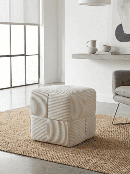 בשל המבנה והגוון הצבע הבהיר, ההדום הזה הוא פתרון נפלא שניתן בעזרתו להאיר פינות חשוכות בבית או להוסיף רכות לסלון בעל רצפה כהה. מומלץ לשלב את ההדום לצד כורסה אפורה או על שטיח ראטן (כפי שניתן לראות בתמונה) כדי ליצור משחקי מרקמים מעניינים ששומרים על קו עיצובי יוקרתי ומזמין.