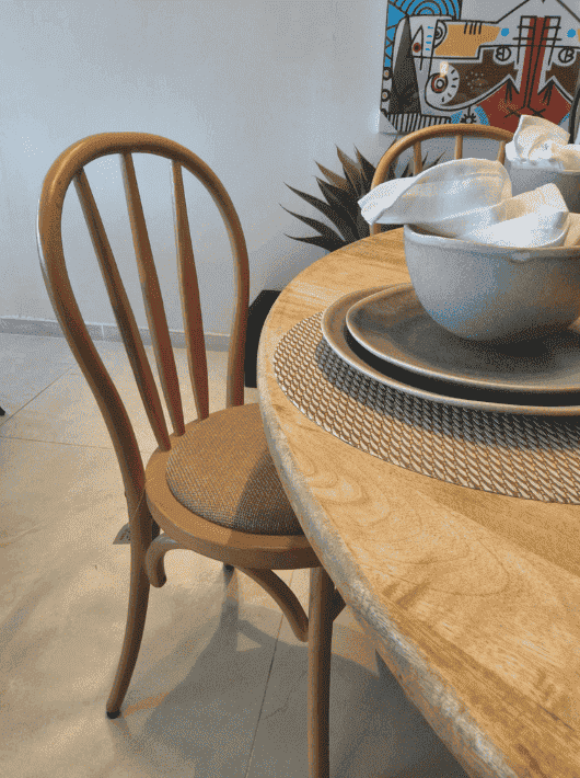זוג כיסאות אוכל מעוצבים עשויים עץ מכופף בגימור טבעי, עם גב מעוגל וקווים רכים המעניקים להם מראה קלאסי ועל-זמני. המושב המרופד מספק נוחות לישיבה יומיומית, בעוד המבנה הקליל והיציב משתלב בקלות סביב שולחן אוכל, במטבח או בפינת אירוח. שילוב מושלם בין פונקציונליות לאסתטיקה טבעית ונקייה.
