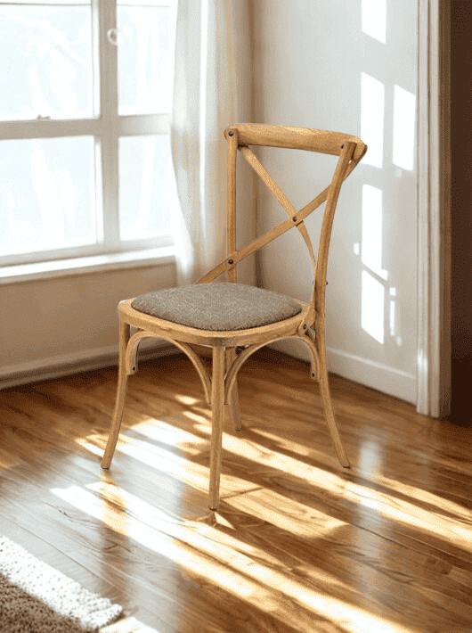כיסא פינת אוכל בעיצוב קלאסי ועל-זמני, המשלב מראה טבעי וחמים עם נוחות יומיומית. שלד הכיסא עשוי עץ איכותי בגימור טבעי המדגיש את הטקסטורה והחומריות, וגב הכיסא בעיצוב איקס מעניק לו אופי אלגנטי ונוכחות מרשימה סביב שולחן האוכל. מושב מרופד בבד נעים לישיבה תומכת ונוחה, המתאים לארוחות ארוכות ולאירוח. הכיסא משתלב בקלות בפינות אוכל בסגנון כפרי, קלאסי או מודרני-רך, ומתאים גם לשילוב במטבח או בפינת ישיבה ביתית.