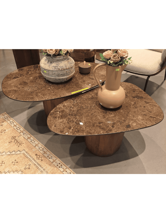 סט שולחנות סלון ייחודי בעיצוב אמורפי מודרני, המשלב בין משטח פורצלן חום יוקרתי לבסיס עגול מעץ מנגו טבעי בגוון חום. הסט כולל שני שולחנות בגדלים שונים, המעוצבים בצורות אורגניות רכות המעניקות לחלל מראה עדכני, מעוצב ועם הרבה שיק. משטחי הפורצלן בגוון חום עמוק עם נימים טבעיים יוצרים תחושת יוקרה, בעוד בסיס העץ המעוגל מוסיף חמימות ונוכחות טבעית.