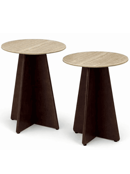 הכניסו איזון מושלם ויוקרה שקטה למרכז הבית עם הסט המרהיב שלנו, של שולחנות צד לסלון המשלבים בסיס עץ מעוצב בגוון אגוז כהה עם פלטת פורצלן עגולה במראה אבן טרוורטין טבעית.