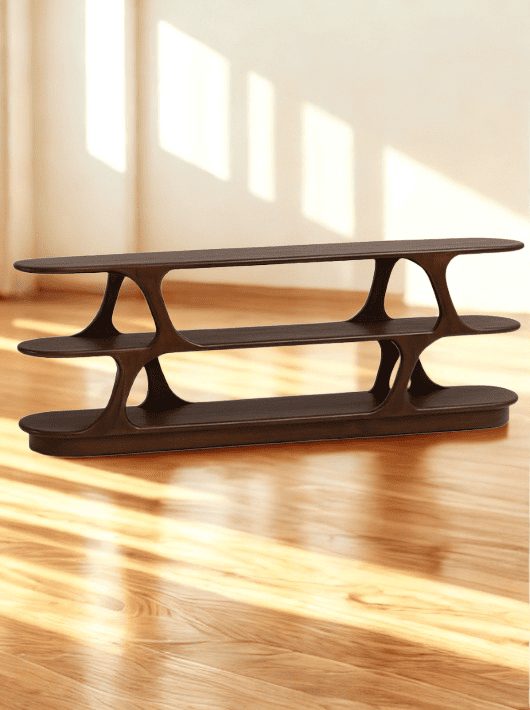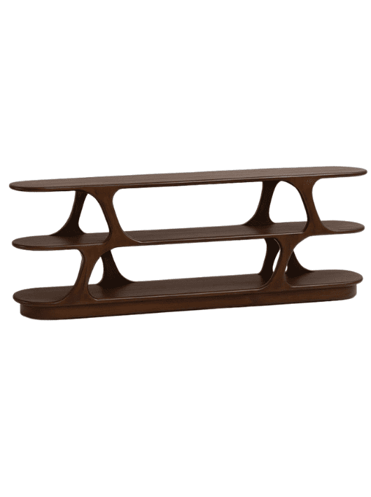 כוננית מדפים מעץ מנגו מלא בגוון אגוז עמוק, בעיצוב מעוגל וזורם שמעניק לחלל תחושת רכות ואלגנטיות. המבנה הייחודי עם שלושה מדפים רחבים יוצר משחק עדין של קווים ותנועה, המשלב בין מראה מודרני לטאץ' טבעי וחמים. הכוננית מתאימה לספרים, פריטי נוי או חפצים אישיים, ומשתלבת בצורה מושלמת בסלון, בחדר השינה או בפינת העבודה. הגימור החלק והצורה האורגנית שלה מעניקים לחלל תחושת זרימה ורוגע.