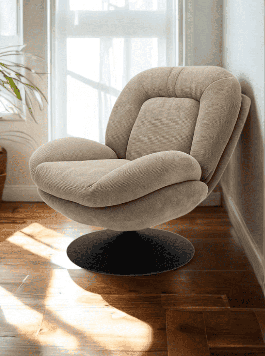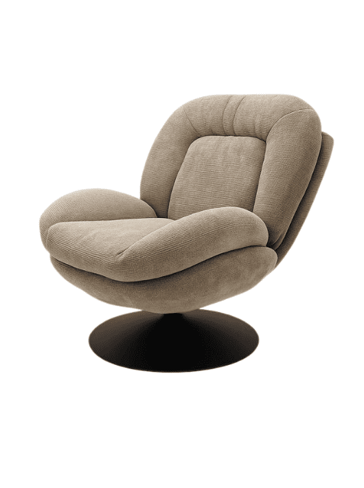 כורסא מעוצבת בעלת מראה רך ומזמין, המשלבת בין קווים מעוגלים לנוחות מושלמת. העיצוב המעוגל מעניק תחושת חיבוק עוטפת, בעוד הבסיס המתכתי השחור מוסיף טאץ’ מודרני ואלגנטי. הכורסא מוסיפה חמימות וסטייל לכל חלל – מושלמת לסלון, לחדר שינה או לפינת מנוחה אינטימית.