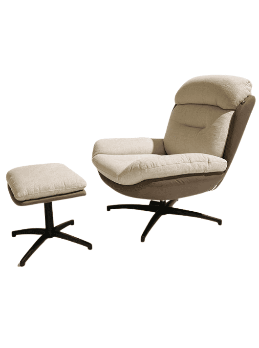 כורסא עם הדום בעיצוב מודרני ונעים, בשילוב גווני שמנת וחום היוצרים מראה חמים ואלגנטי. המושב והמשענת מרופדים בבד טקסטיל איכותי בצבע שמנת רך, בעוד גב הכורסא והבסיס עשויים מבד דמוי עור בגוון חום טבעי – שילוב שמעניק עומק, אופי ותחושת יוקרה לחלל. הבסיס עשוי מתכת שחורה חזקה ויציבה, המוסיפה קונטרסט עדין ומראה עכשווי. הכורסא כוללת מנגנון נדנוד עדין המעניק תחושת רוגע ותנועה קלילה, יחד עם הדום תואם לנוחות מרבית.