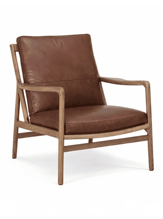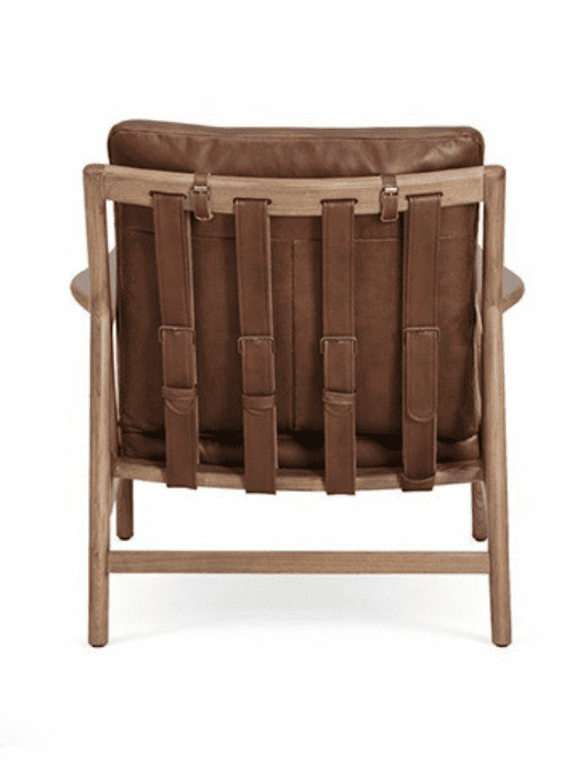 כורסת עור חום המשלבת עיצוב נוסטלגי עם טאץ' מודרני. הכורסה מתאפיינת בשלד עץ בעל קווים מעוגלים וזורמים, עם משענות ידיים מעוצבות המשתלבות במבנה הרגליים. גב הכורסה גבוה ומספק תמיכה מלאה, כאשר בחלקו האחורי מופיע אלמנט עיצובי בולט של רצועות רחבות המעגנות את הריפוד לשלד העץ ומוסיפות עניין ויזואלי ייחודי.