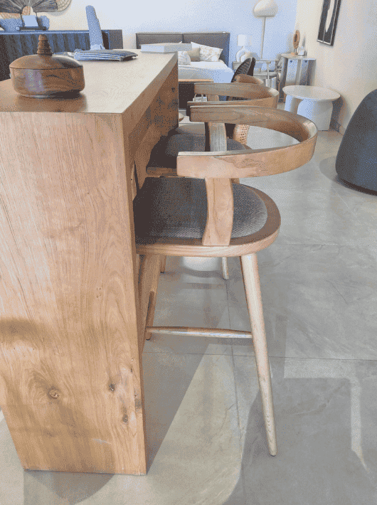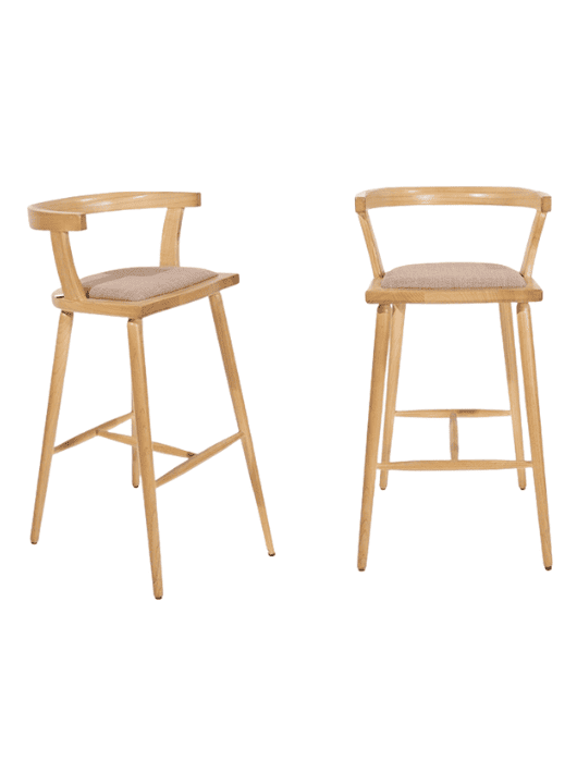 כיסא בר אלגנטי המשלב שלד עץ בוקיצה בגימור טבעי עם מושב מרופד טקסטיל לנוחות מרבית. העיצוב הקליל עם משענת גב תומכת וקווים רכים מעניק מראה על-זמני שמשתלב בקלות במטבח, סביב אי או בדלפק אוכל. שילוב מושלם בין נוחות, יציבות ואסתטיקה טבעית, המתאים לחללים בסגנון כפרי, בוהו או מודרני-חמים.