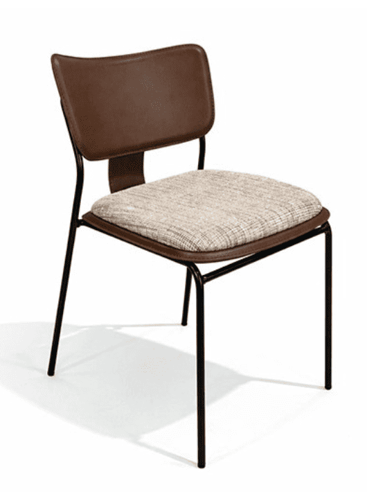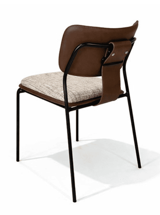 המושב מרופד בבד טקסטיל איכותי ונעים למגע, בעוד המשענת עשויה בד דמוי עור בגוון שוקולד עמוק, מה שמעניק לכיסא עומק ויזואלי יוצא דופן.