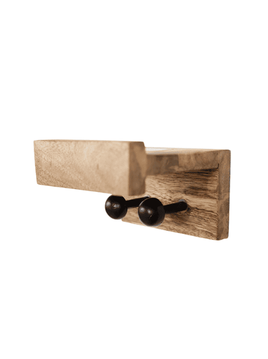 מדף צר מעץ מנגו טבעי עם שני מתלים – פריט קטן ושימושי לקיר, המשלב מדף להצבה של חפצים קטנים יחד עם שני מתלים לתלייה. מתאים במיוחד לאזור כניסה, חדר שינה, מסדרון או חדר ילדים. מעניק מראה חמים של עץ טבעי ומוסיף פתרון אחסון נוח בלי לתפוס מקום.