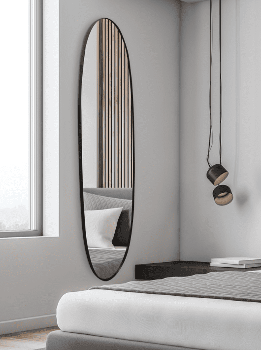 מראה אובלית בעיצוב צר ואלגנטי עם מסגרת מתכת שחורה דקה, המשדרת מינימליזם וסטייל מודרני. הצורה המאורכת מעניקה תחושת גובה ופתיחות, ומשלימה בצורה מושלמת כל חלל, בין אם בחדר שינה, במסדרון או במבואת הכניסה. המראה מוסיפה עומק ואור לחלל, ומתאימה במיוחד לעיצוב נקי וסולידי עם נגיעה יוקרתית.