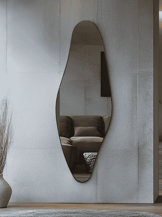 מראה אמורפית בעיצוב אסימטרי מהמם עם מסגרת מתכת שחורה, המשלבת בין עיצוב מודרני לקווים רכים וזורמים. צורתה הייחודית שוברת את המראה הקלאסי ומוסיפה לחלל תחושת תנועה ואלגנטיות לא מתאמצת. מתאימה במיוחד לסלון, חדר שינה, מבואה או חללי עיצוב מודרניים המבקשים טוויסט אמנותי ויוקרתי.