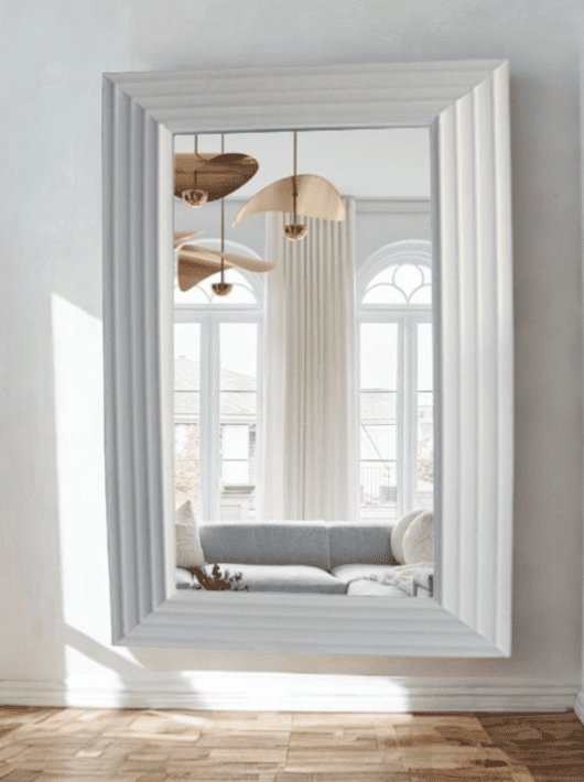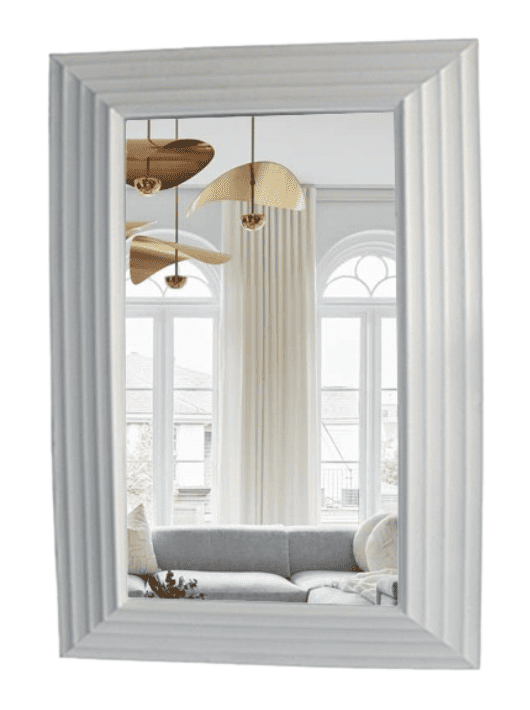מראה גדולה בעיצוב מרשים ונקי, בעלת מסגרת עץ רחבה בגוון לבן אלגנטי המעניק תחושת אור, רעננות ויוקרה לכל חלל. קווי המסגרת המדורגים כלפי חוץ יוצרים מראה עמוק ודינמי, שמוסיף עניין ואלגנטיות לחלל. הגוון הלבן משתלב בקלות עם מגוון סגנונות עיצוב ומדגיש את תחושת המרחב והשלווה בחדר. המראה מתאימה במיוחד לתלייה על הקיר או להעמדה חופשית כנגד הקיר, ומשלימה כל פינה בעדינות ובסטייל עכשווי.