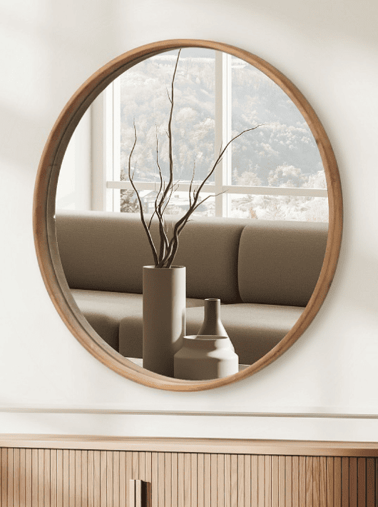 מראה עגולה קלאסית בעלת מסגרת מעץ טבעי שמכניסה חמימות, רוך ואופי לחלל. שילוב הצורה המעוגלת עם הגוון החמים של העץ יוצר מראה טבעי ומאוזן המתאים כמעט לכל סגנון עיצוב. המסגרת מעניקה תחושת איזון ורוגע לכל חלל שבו היא ממוקמת – בין אם מעל שידת כניסה, קונסולה או על הקיר בחדר השינה.