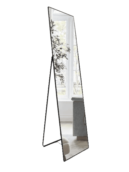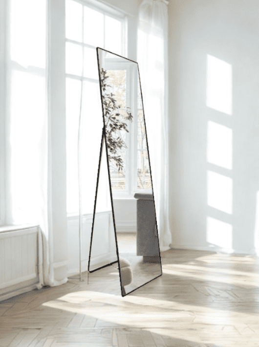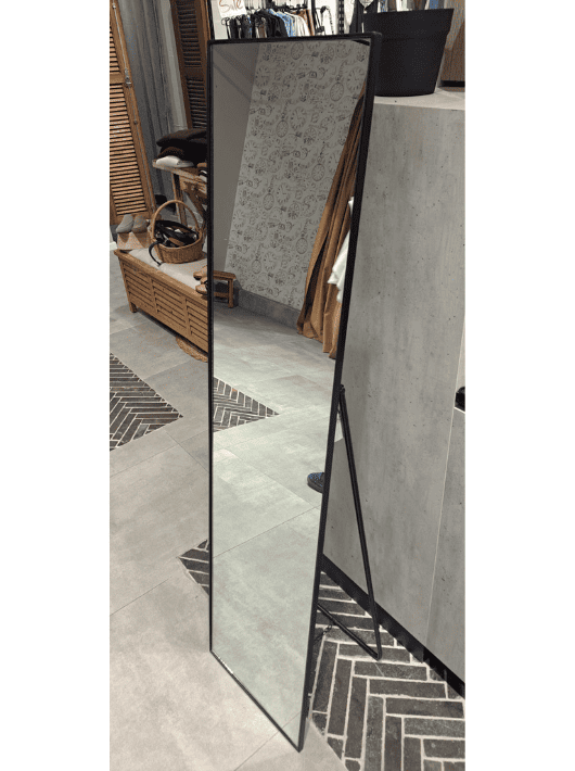 מראה עומדת בעיצוב מלבני אלגנטי ומודרני, עם מסגרת מתכת שחורה דקה שמעניקה לה מראה מינימליסטי ומוקפד. המראה ניצבת על רגלית אחורית יציבה, המאפשרת להציב אותה בכל מקום בבית – בחדר השינה, במסדרון או בחדר הארונות. היא משדרת תחושת מרחב ואור, ומתאימה במיוחד לחללים המעוצבים בסגנון נקי ועכשווי.