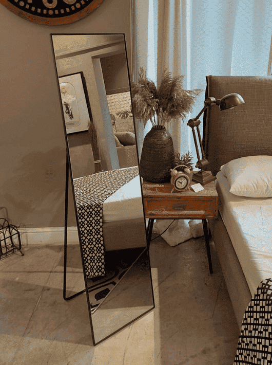 היופי במראה עומדת עם רגלית הוא החופש המוחלט שהיא נותנת לכם – היא לא מחויבת לקיר וזה היתרון העיצובי הגדול שלה. במקום להצמיד אותה לקיר כרגיל, נסו להציב אותה באלכסון בפינת החדר. המיקום האלכסוני יוצר עומק תלת-ממדי מפתיע "מאחורי" המראה, מה שמעלים את הזווית של הקיר ונותן תחושה שהחדר ממשיך הלאה. זה הופך את המראה מרהיט פשוט לאלמנט של עיצוב מודרני ששובר את המבנה המרובע של החדר ומוסיף המון סטייל וקלילות.