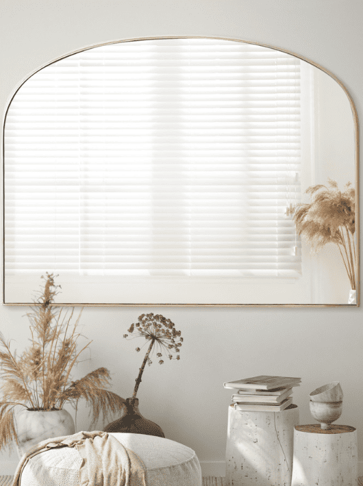 מראת קשת עם מסגרת מתכת בגוון זהב עדין, בעיצוב חצי מעוגל המשדרת רכות ויוקרה בחלל. המסגרת הדקה מוסיפה טאץ' מודרני ומדויק, בעוד שהצורה הקלאסית של הקשת יוצרת תחושת גובה ואור נעימה לעין.