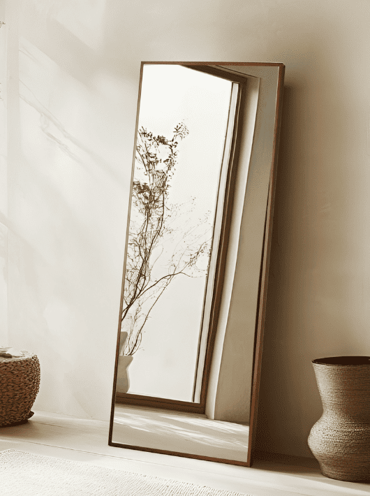 מראת גוף בעיצוב מלבני עם מסגרת עץ טבעי, המשדרת חמימות, ניקיון ואסתטיקה קלאסית. המראה מתאימה במיוחד לחדר שינה, חדר ארונות או מבואת כניסה, ומשלבת באופן מושלם בין פונקציונליות ליופי טבעי.