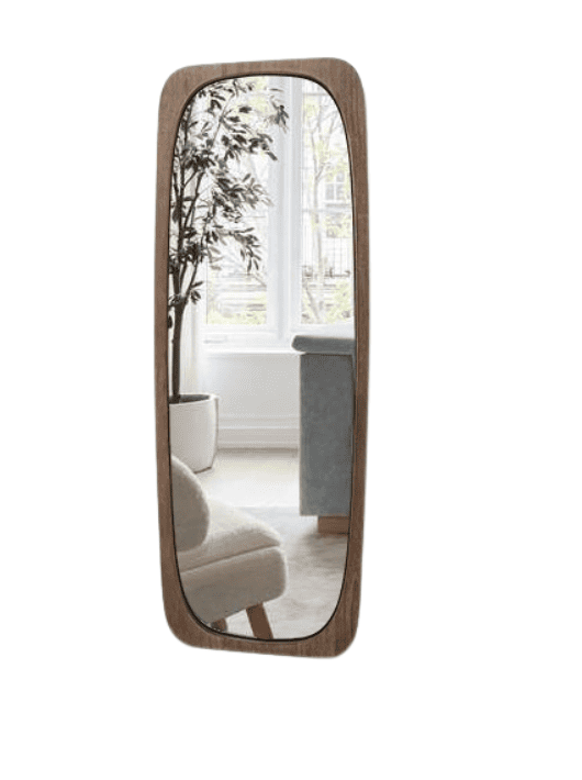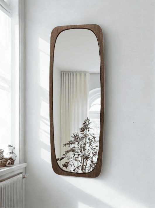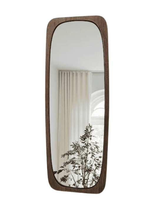 מראת גוף אלגנטית בעלת מסגרת עץ טבעי בגוון חום עמוק, בעיצוב נורדי נקי וחמים. הקווים המעוגלים מעניקים לה מראה רך וזורם המשתלב היטב בכל סגנון עיצוב – מהקלאסי ועד המודרני.