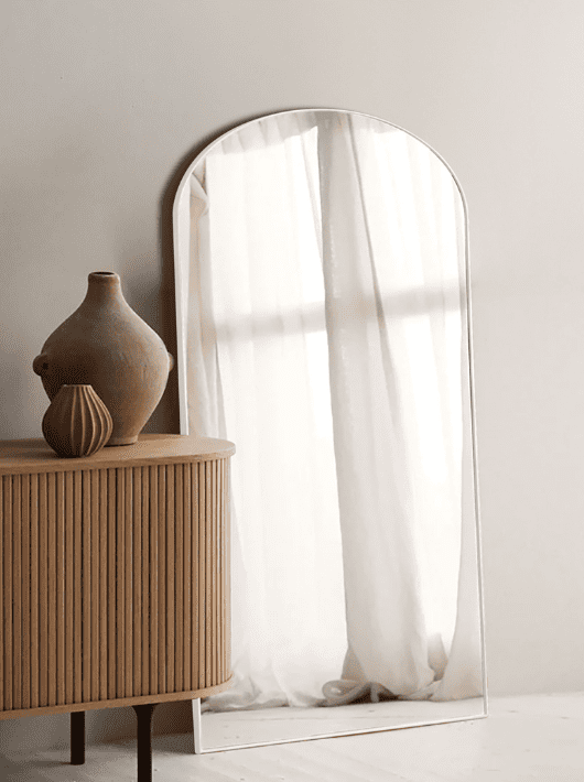 מראת קשת בעיצוב נקי ומעודן, עם מסגרת מתכת בגוון לבן המעניקה לחלל תחושת רכות ואלגנטיות. צורת הקשת העליונה מוסיפה טאץ' אדריכלי נעים ומודרני, המשתלב בקלות עם סגנונות עיצוב שונים. המראה הגדולה משדרגת כל חלל, מוסיפה תחושת עומק ומאפשרת משחק של אור והשתקפות.
