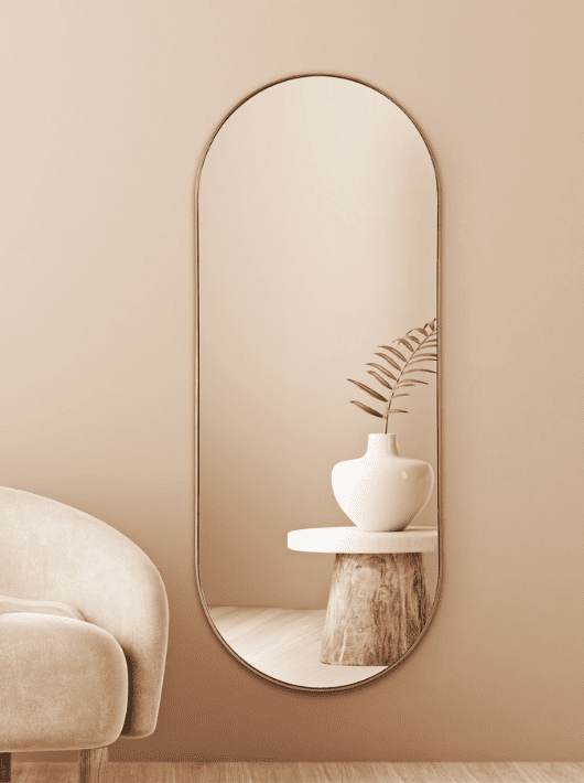 מראה לקיר בעיצוב קפסולה רחבה עם מסגרת מתכת בגוון זהב אלגנטי. הצורה המעוגלת והנקייה מעניקה לחלל תחושת רכות ויוקרה עדינה.