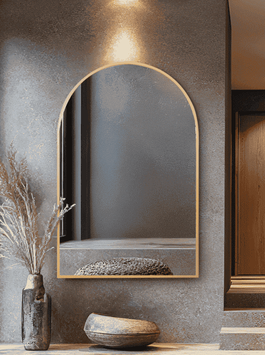 מראת קשת עם מסגרת מתכת בגוון זהב, בעיצוב אלגנטי המשדר יוקרה וחמימות גם יחד. החלק העליון המעוגל מוסיף רכות ותחושת גובה, בעוד שהמסגרת הנקייה מעניקה למראה מראה מודרני ומעודן.