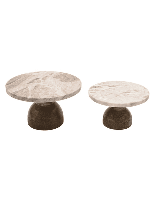 סטנד הגשה מעוצב המשלב פלטת שיש עגולה בגוון טבעי עם בסיס עץ מלא, ליצירת מראה אלגנטי ונוכחות ייחודית על השולחן. הסטנד מתאים להגשת עוגות, קינוחים, פירות או גבינות, ומשמש גם כאלמנט דקורטיבי שמשדר סטייל טבעי ומעודן. משתלב בקלות במטבח, בפינת אוכל או על שולחן סלון, ומוסיף טאץ' עיצובי יוקרתי ונעים.