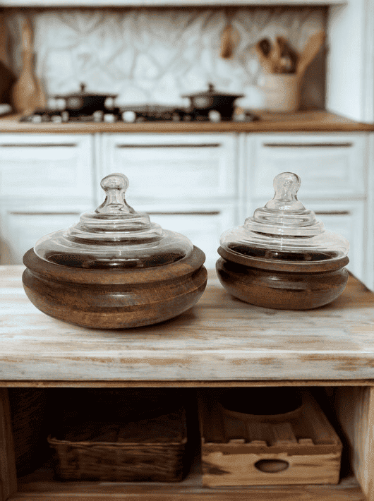 סט 2 קערות הגשה ייחודי ומעוצב המשלב בין חמימות העץ הטבעי לאלגנטיות של זכוכית שקופה. הקערות עשויות עץ בגוון אגוז עמוק ועשיר, ומגיעות עם מכסי זכוכית בעיצוב פגודה מדורג, המוסיף טאץ' ייחודי ומרשים לכל חלל. מתאים לאחסון ממתקים, עוגיות, סוכריות או כאביזר דקורטיבי בפני עצמו על שולחן סלון, מטבח או מזנון.