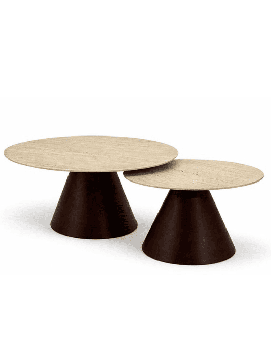 הכניסו נוכחות פיסולית ויוקרה בלתי מתפשרת למרכז הסלון עם סט מהמם של שולחנות עגולים לסלון המאופיינים בבסיס עץ קונוס רחב ומסיבי בגימור אגוז כהה, המעניק יציבות מקסימלית ומראה דומיננטי.