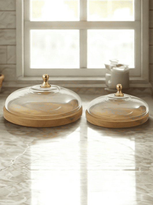 סט אלגנטי של 2 צלחות הגשה מעוצבות עם מכסה דמוי כיפה מזכוכית – מושלם להגשת עוגות, מאפים, גבינות ופירות בצורה אסתטית ומוגנת. בסיס העץ בגוון טבעי מוסיף חמימות וסגנון מודרני-קלאסי לשולחן, בעוד שמכסה הזכוכית מעניק נראות מלאה לתוכן ושומר על טריות והיגיינה. ידית זהובה בחלק העליון משלימה את המראה היוקרתי ומאפשרת פתיחה נוחה וקלה.