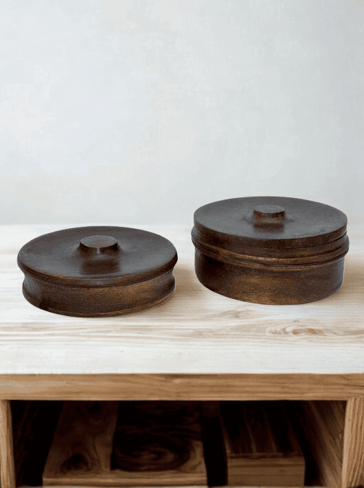 סט של שתי קופסאות אחסון מעץ בגוון אגוז עמוק וחמים, בעיצוב עגול ונקי עם מכסים תואמים. הגוון הכהה מדגיש את הטקסטורה הטבעית של העץ ומעניק לסט מראה אלגנטי המשתלב נהדר בסלון, חדר שינה, מטבח או על שידת איפור. הקופסאות משלבות בין אסתטיקה לשימושיות – גם פריט דקורטיבי מרשים וגם פתרון אחסון לפריטים קטנים.