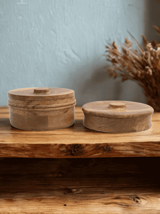 סט אלגנטי של שתי קופסאות אחסון מעץ בגוון טבעי, בעיצוב עגול ונקי עם מכסים תואמים. הקווים הרכים והגימור הטבעי של העץ יוצרים מראה חמים וביתי, המתאים לסלון, חדר שינה, מטבח או משרד ביתי. הקופסאות משלבות בין פריט דקורטיבי לאחסון שימושי של פריטים קטנים, ומוסיפות לחלל טאץ' טבעי ונעים.