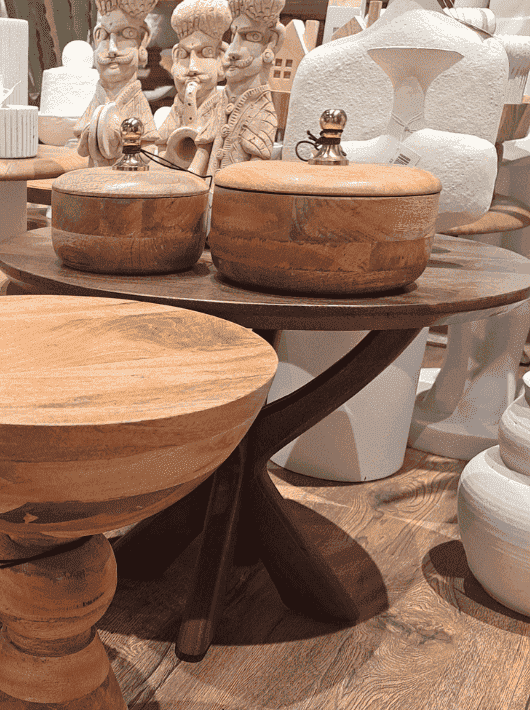 במקום להצמיד אותם אחד לשני כסט סגור, נסו את שיטת "המרחק הנושם". הניחו את השולחן העגול הגדול במרכז אזור הישיבה, ואת שולחן הצד הקטן מקמו דווקא בקצה המרוחק של הספה או ליד כורסה נפרדת. בגלל שלשניהם יש את אותן רגליים מעוצבות (בסגנון ה-Arch) ואותו גוון עץ מנגו חם, העין שלכם תחבר ביניהם אוטומטית ותיווצר תחושה של חלל גדול ומתוכנן היטב, בלי שהרהיטים ייראו "תקועים" אחד בתוך השני. זה פתרון מעולה אם אתם רוצים שהסלון ייראה מאוורר ופחות עמוס ברהיטים כבדים במרכז.