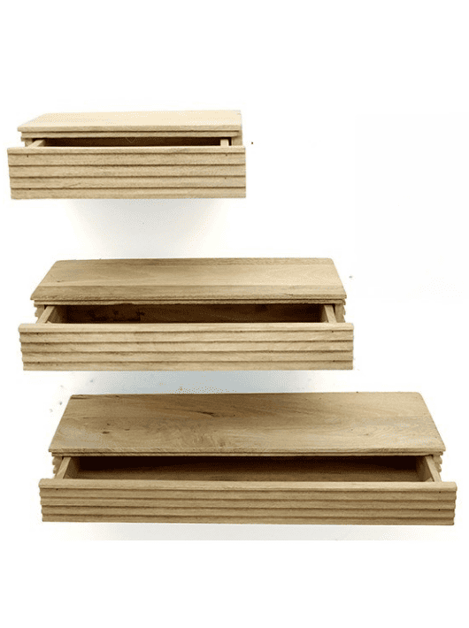 סט 3 מדפים מעץ בגוון טבעי, עם מראה "צף" נקי ומינימליסטי, המשולבים כל אחד עם מגירה נסתרת לשמירה על חפצים קטנים. העיצוב השטוח והישר מאפשר תלייה נוחה גם בחללים קטנים ומעניק לקיר מראה מסודר ומעודן. מתאים לכניסה לבית, חדר שינה, סלון, חדר עבודה או חדר ילדים.