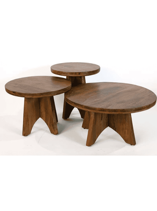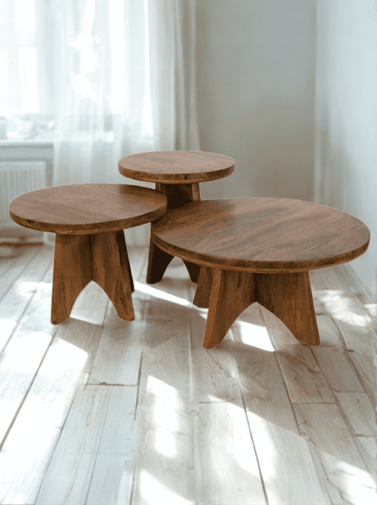 סט 3 שולחנות עגולים ייחודי עשויים מעץ מנגו מלא בגוון חום דבש חמים, המשדר תחושת טבע ואלגנטיות כפרית. העיצוב העגול משתלב בקלות בכל סגנון עיצוב – מבוהו טבעי ועד מודרני. ניתן להציב חלק מהשולחנות יחד ליצירת קומפוזיציה מרשימה, או להפריד ביניהם לשימושים שונים ברחבי הבית. משטחי העץ העבים ורגלי ה־X הרחבות מבטיחים יציבות מרבית ועמידות לאורך שנים, כשהגימור החלק שומר על מראה טבעי ומגע נעים.