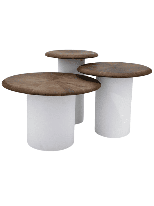 הפלטות המעוגלות מונחות על בסיסי גליל ממתכת בגוון אייבורי נקי, היוצר ניגודיות מרעננת לעץ החמים. בזכות המבנה המדורג, הסט מעניק גמישות עיצובית אינסופית – ניתן להשתמש בהם כקבוצה דומיננטית במרכז הסלון או לפזר אותם כנקודות שונות ברחבי הבית. אלו שולחנות שמשלבים אסתטיקה של לופט מודרני עם רכות של חומרים מהטבע.