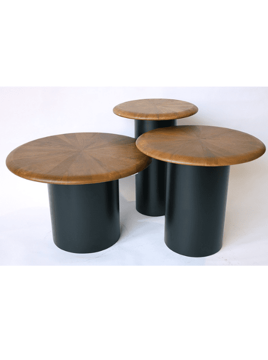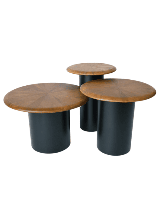 סט 3 שולחנות קפה מעוצבים בסגנון מודרני-תעשייתי, המשלב בין משטחי עץ מנגו טבעי לגימור בסיס ממתכת שחורה במראה חלק ונקי. הסט כולל שלושה שולחנות בגדלים שונים, הניתנים להצבה כיחידה אחת או לפיזור בחלל, ליצירת מראה דינמי ושימושי. משטחי העץ העגולים מדגישים את טקסטורת העץ הטבעית ומוסיפים חמימות לבית, בעוד הבסיס הגלילי השחור יוצר ניגוד אלגנטי ונוכחות מרשימה.