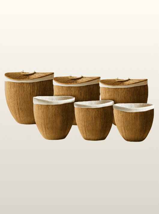 סט 6 סלי כביסה יוטה בעיצוב טבעי ומעודן, המשלב מראה בוהו חמים עם פונקציונליות יומיומית. הסלים מעוצבים בקווים מעוגלים ורכים, עם טקסטורת יוטה אנכית שמוסיפה עומק וחומריות טבעית. שלושת הסלים הגדולים מגיעים עם מכסה תואם. כל הסלים כוללים בטנה פנימית מבד לבן לנוחות שימוש מירבית.