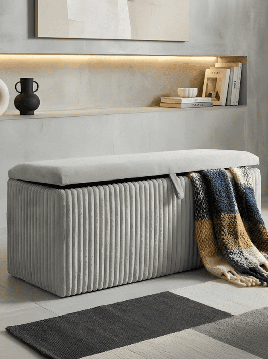 ספסל אחסון מעוצב ומרשים המשלב נוחות פונקציונלית עם סטייל מודרני. הספסל מתאפיין בטקסטורת פסי פרווה אנכיים המעניקים לו מראה עשיר ורך, ומשתלב בצורה מושלמת בחדרי שינה, מבואות כניסה או בחלל המגורים. בזכות המבנה המאורך והגוון האפור הניטרלי, הוא מהווה פריט דקורטיבי המשרה אווירה יוקרתית ורגועה.