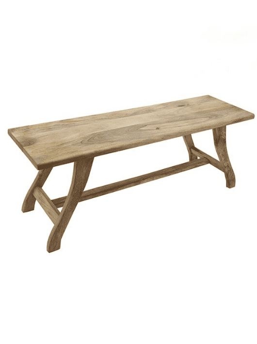 ספסל עץ מעוצב בסגנון כפרי חמים וטבעי, עשוי עץ מנגו מלא בעל טקסטורה טבעית. העיצוב הפשוט והנקי בשילוב רגליים מעוצבות יוצר מראה אותנטי שמתאים לחללים טבעיים, ביתיים ומזמינים.
