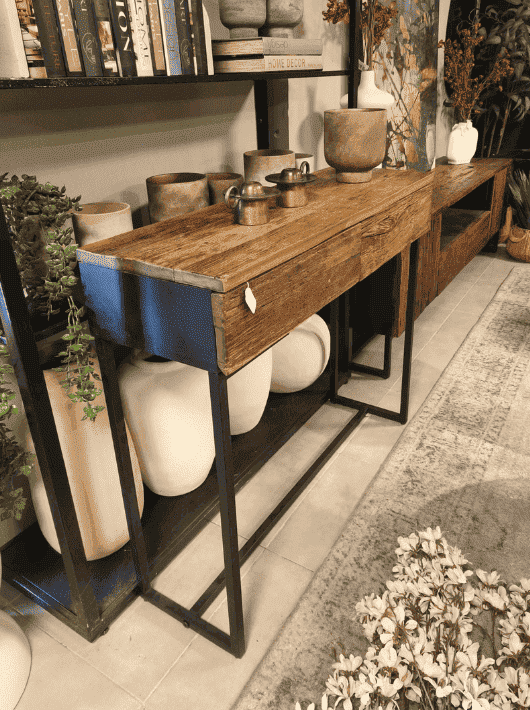 קונסולה כפרית עם שתי מגירות בעיצוב חם ומזמין. שילוב של עץ במראה טבעי בעל טקסטורה ייחודית עם רגלי מתכת שחורות שיוצר רהיט אלגנטי ומלא אופי. הקונסולה מתאימה לכניסה לבית, למסדרון או לסלון ומוסיפה תחושת חמימות לכל חלל. שתי המגירות מעניקות פתרון אחסון נוח לחפצים יומיומיים כמו מסמכים, מפתחות ואביזרים קטנים כך שהבית נשאר מסודר ונעים.