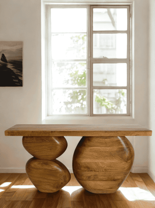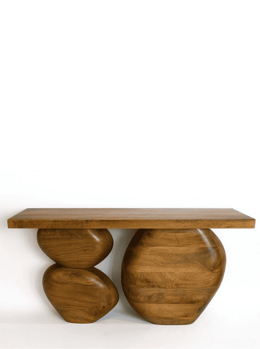 קונסולה לכניסה לבית בעיצוב שונה וייחודי שמביא איתו מראה שלא רואים בכל בית. בסיס הקונסולה בנוי מצורות מעוגלות בעלות נפח שמזכירות אבני נחל טבעיות המוסיפות לחלל תחושת טבע, עומק וחמימות. החלק העליון ישר ונקי ומאפשר הנחה של חפצי נוי, עציצים, או מגש מפתחות בצורה נוחה ומסודרת.