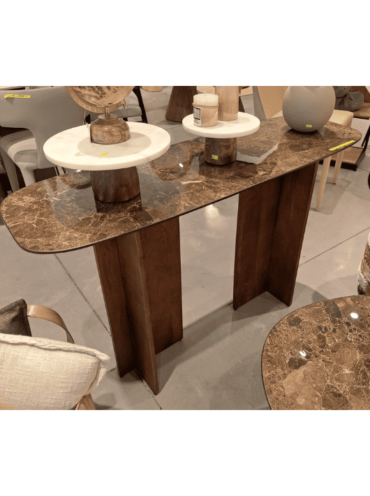 קונסולה לכניסה בעיצוב מודרני ואלגנטי, עשויה עץ מנגו טבעי בגוון חום עשיר בשילוב משטח פורצלן בגוון חום יוקרתי עם פינות מעוגלות. השילוב בין המרקם החם של העץ למראה האלגנטי של הפורצלן יוצר רהיט שמשלב בין טבעי למודרני בצורה מושלמת.