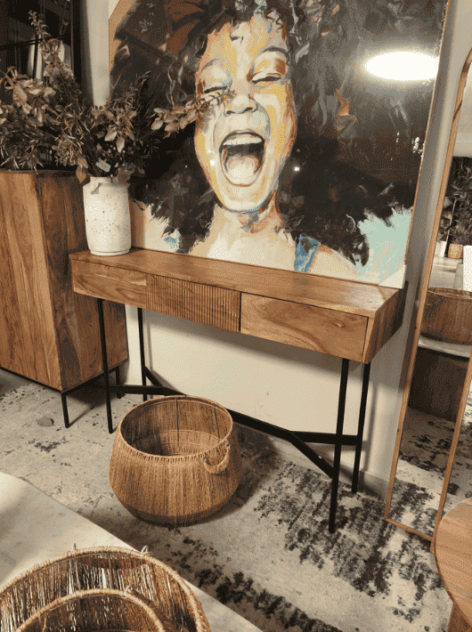 קונסולה צרה לכניסה שמשלבת עיצוב מינימליסטי עם פונקציונליות חכמה. לקונסולה שלוש מגירות שמספקות פתרון אחסון נוח למפתחות וחפצים יומיומיים, בעוד שהחזית משלבת עץ טבעי עם חריטות אנכיות במרכז ליצירת מראה מעודן ומודרני. לקונסולה בסיס רגלי מתכת שחורות שמוסיף יציבות וניגוד עיצובי מודרני, והגוון החמים של העץ משתלב בקלות בכל חלל כניסה.