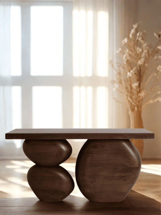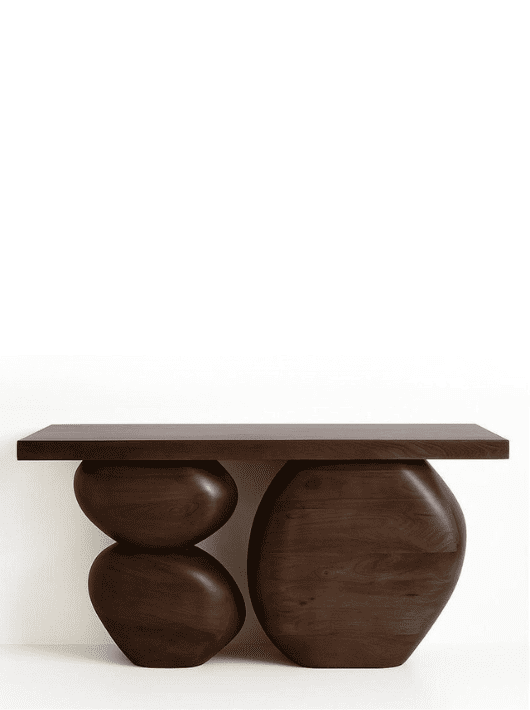 קונסולה לכניסה לבית בעיצוב ייחודי שמעניק לחלל מראה טבעי ומרשים שלא רואים בכל בית. בסיס הקונסולה עשוי צורות מעוגלות בעלות נפח שמזכירות אבני נחל חלקות ומוסיפות חמימות עומק ונוכחות טבעית. המשטח העליון רחב, ישר ונקי ומאפשר להניח עליו חפצי נוי, עציצים, או מגש מפתחות בצורה מסודרת ונוחה.