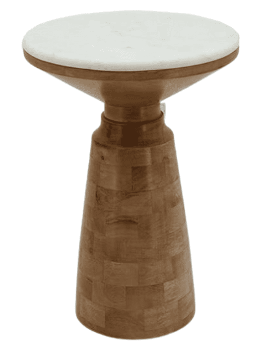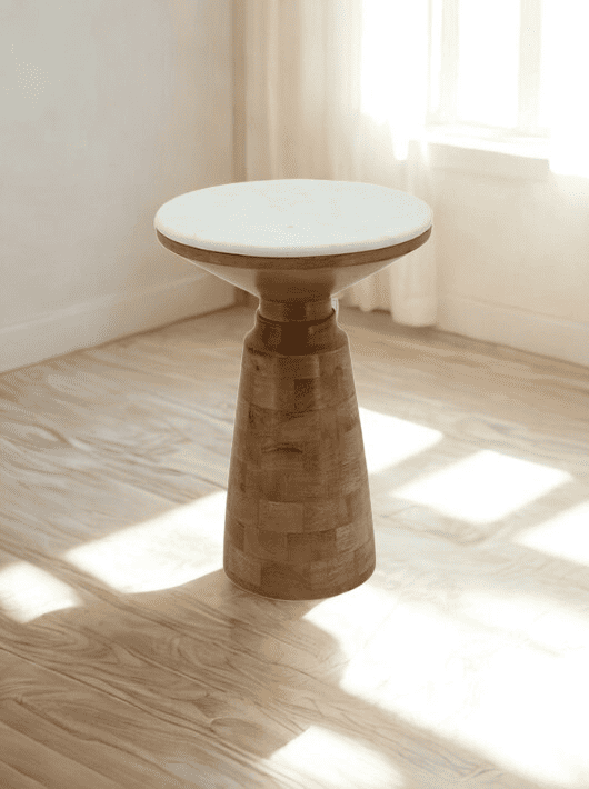 שולחן צד לספה עם בסיס עץ קוני ומשטח שיש