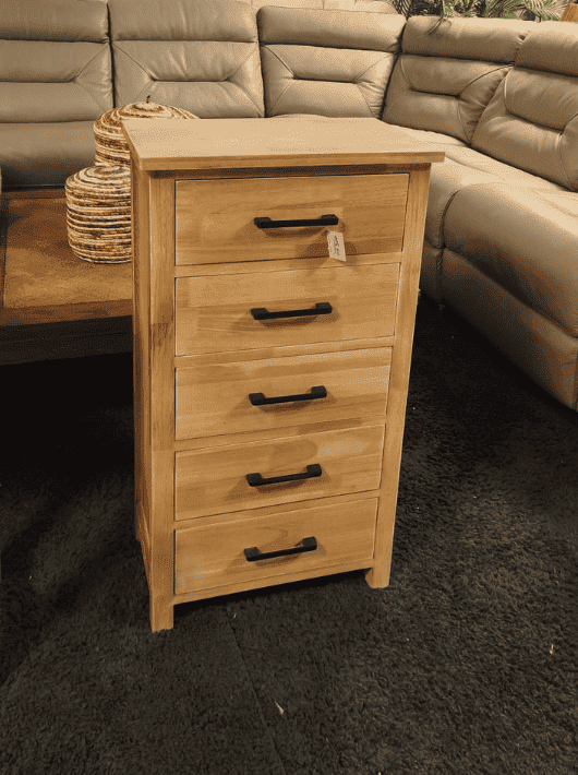 שידת מגירות עשויה עץ מלא בגימור טבעי וחמים, בעיצוב נקי ועל-זמני המשתלב בקלות בחדר שינה, בחדר עבודה או במסדרון. השידה כוללת חמש מגירות לאחסון נוח של טקסטיל, מסמכים או חפצים יומיומיים, ומצוידת בידיות מתכת כהות המוסיפות ניגודיות עדינה ואופי עיצובי. המבנה הגבוה והצר מאפשר ניצול יעיל של שטח, תוך שמירה על מראה אלגנטי ומסודר בחלל.