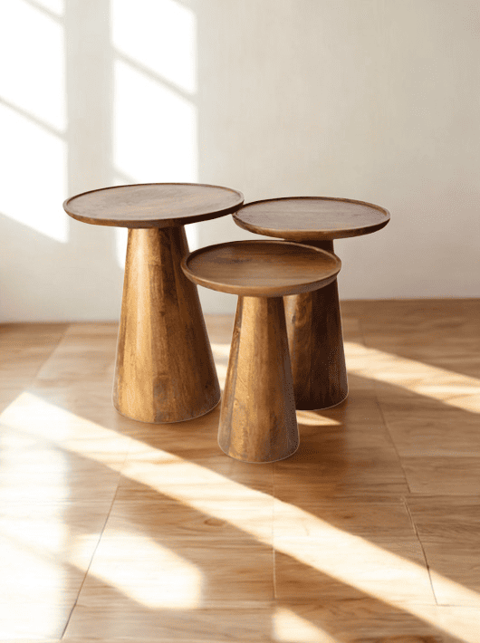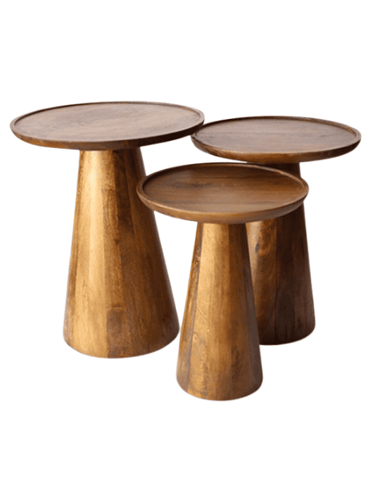 שלישיית שולחנות צד מעץ מנגו בגוון חם וטבעי שיוסיפו מיד לכל חלל מראה מעוצב ונעים. הסט כולל שלושה שולחנות בגבהים שונים שמתאימים לשימוש יחד או בנפרד ויוצרים קומבינציה מושלמת ליד ספה כפריט דקורטיבי או כפתרון נוח להנחת חפצים. העץ בעל טקסטורה טבעית וייחודית והבסיס הרחב מעניק יציבות גבוהה. השילוב בין הצורה הנקייה לחומר הגלם האיכותי הופך את הסט לפריט שמתאים לכל סגנון עיצוב מודרני או טבעי.