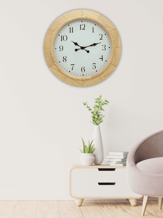 שעון קיר גדול בקוטר 68 ס"מ, בעיצוב טבעי וחמים שמוסיף אסתטיקה נקייה לכל חלל. המסגרת עשויה עץ טבעי בגוון בהיר ונעים, שמעניקה תחושת רוגע ומראה על-זמני שמתאים לכל בית.