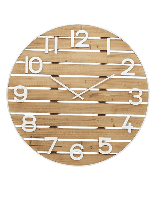 השעון משלב לוחות עץ בעיצוב סטריפים אופקי, המעניק מראה טבעי וחמים, יחד עם ספרות וליין-ארט במחוגים בצבע לבן ליצירת קונטרסט מודרני ונקי. בזכות הקוטר הגדול שלו, השעון הופך מיד לפריט מרכזי בחלל – מושלם לסלון גדול, לפינת אוכל, למשרד או לקיר כניסה לבית.